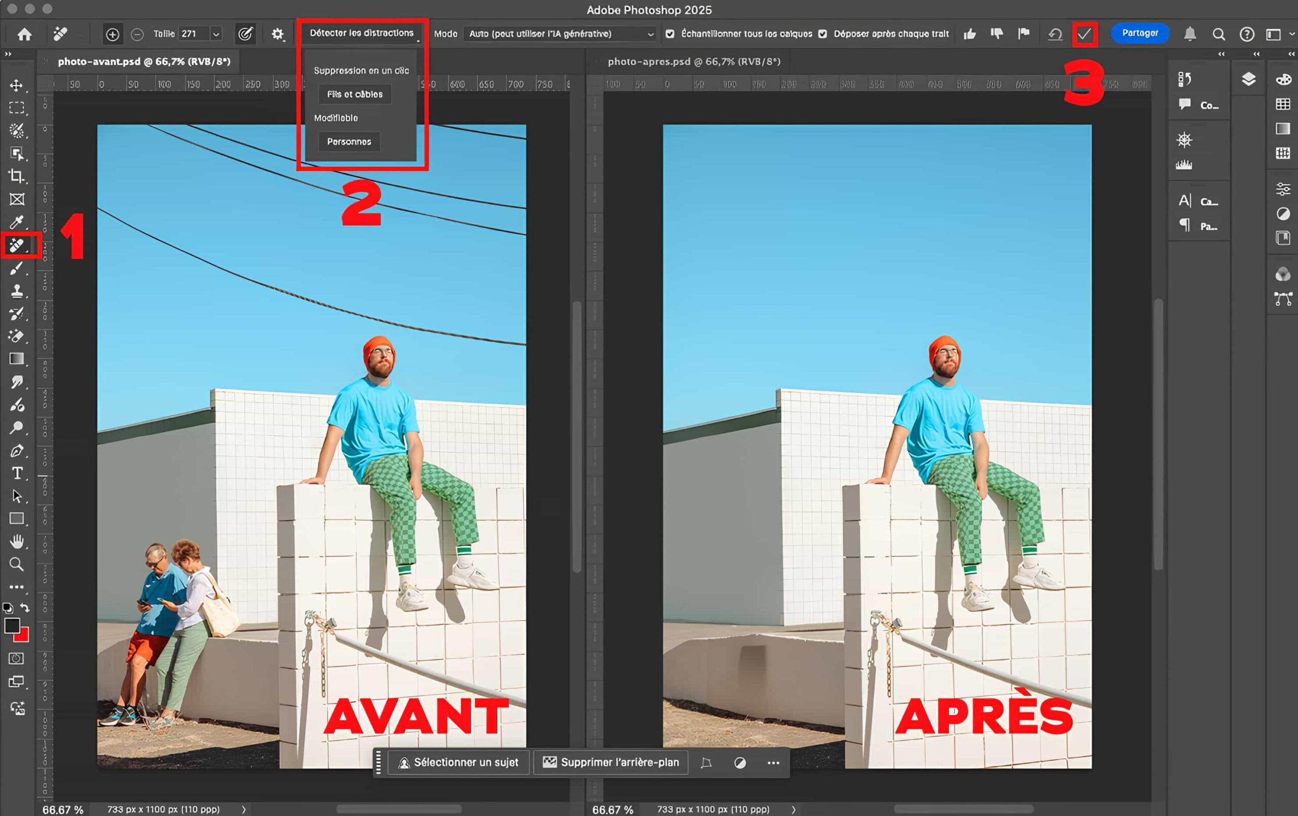 La nouvelle fonction de suppression des distractions permet d’éliminer facilement des Ă©lĂ©ments indĂ©sirables tels que des cĂąbles ou des personnes. GrĂące Ă  l’intelligence artificielle, il suffit de sĂ©lectionner l’objet Ă  supprimer, et Photoshop se charge du reste.